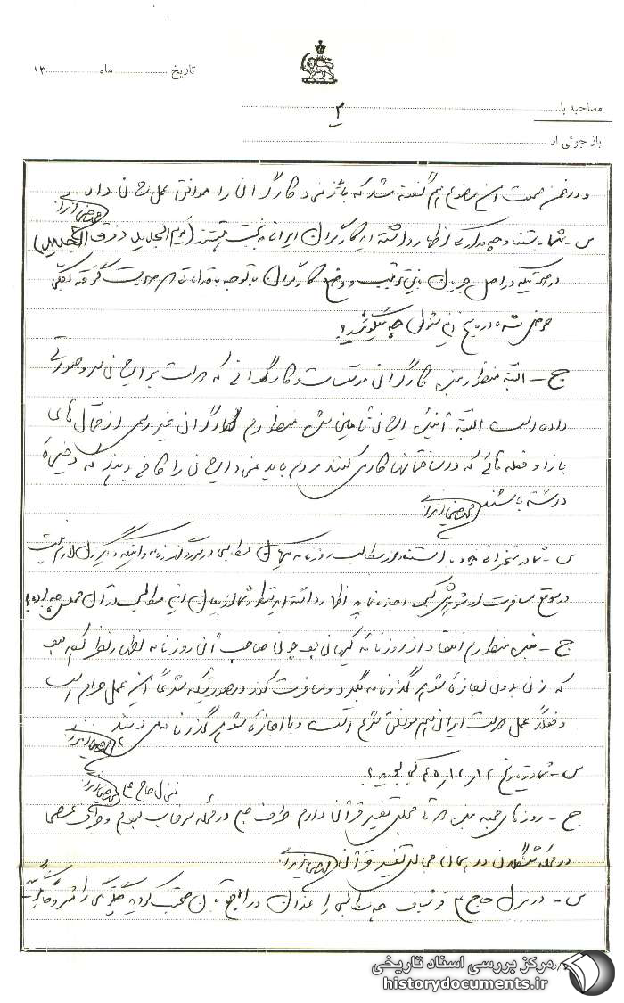 ج - بنده چون مسلمان هستم و تابع دین و بزرگان دینم و این عمل که خدا نکرده انسان مردم را تحریک بر ضد امنیت مملکت شیعه بنماید، حرام و گناه است، و تا حال، با تأیید خداوند متعال، این کار را نکرده ام و ان شاءاله نخواهم کرد.