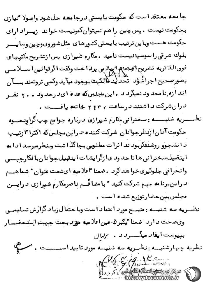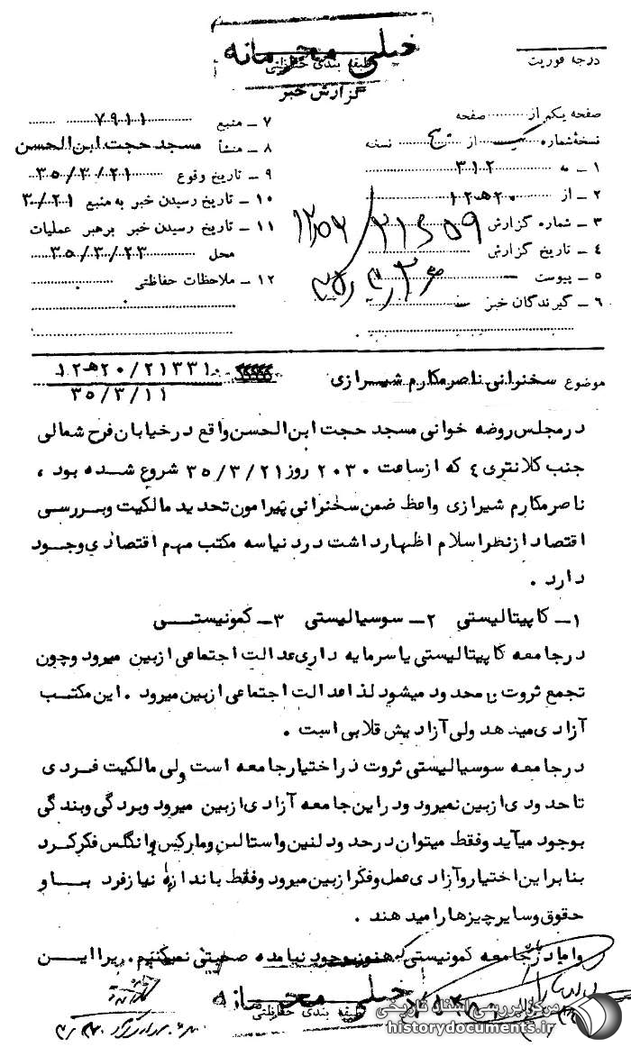 در مجلس روضهخوانی مسجد حجتابنالحسن واقع در خیابان فرح شمالی جنب کلانتری 4 که از ساعت 2030 روز 21 /3 /35 شروع شده بود، ناصر مکارم شیرازی واعظ ضمن سخنرانی پیرامون تحدید مالکیت و بررسی اقتصاد از نظر اسلام اظهار داشت. در دنیا سه مکتب مهم اقتصادی وجود دارد.