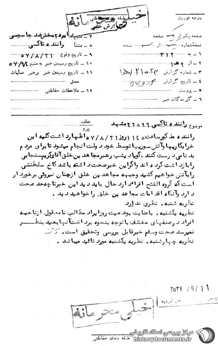 راننده مذکور ساعت 1145 روز 21 /8 /57 اظهار داشت کلیه این خرابکاریها و آتشسوزیها توسط خود دولت انجام میشود تا برای مردم بدنامی درست کنند و گویا دیشب رهبر مجاهدین خلق1 آقای کریم سنجابی2 را بازداشت کردهاند و اگر این خبر صحت داشته باشد کاخ سلطنتی را به آتش خواهیم کشید و جبهه مجاهدین خلق از چنان نیروئی برخوردار است که گروه الفتح3 اقرار دارد؛ حال باید دید این خبر تا چه حد صحت دارد و آنگاه اقدامات مجاهدین خلق را خواهید دید.