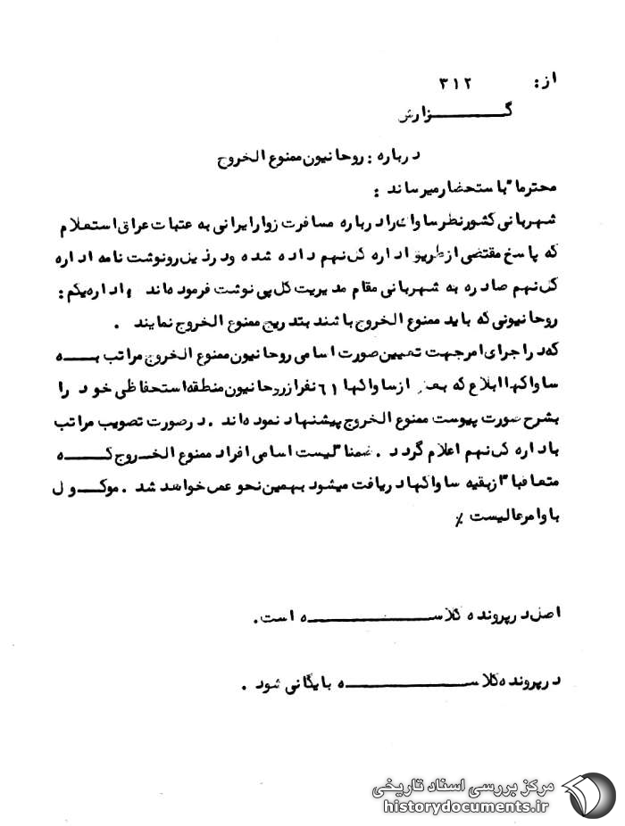 که در اجرای امر جهت تعیین صورت اسامی روحانیون ممنوعالخروج مراتب به ساواکها ابلاغ که بعضی از ساواکها 61 نفر از روحانیون منطقه استحفاظی خود را به شرح صورت پیوست ممنوعالخروج پیشنهاد نمودهاند. در صورت تصویب مراتب به اداره کل نهم اعلام گردد. ضمناً لیست اسامی افراد ممنوعالخروج که متعاقباً از بقیه ساواکها دریافت میشود به همین نحو عمل خواهد شد. موکول به اوامر عالیست.