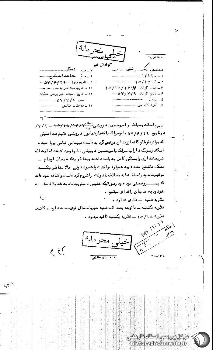 در تاریخ 29 /6 /57 باقر سرلک بافتخار همایون درویشی متهم ضدامنیتی که بر