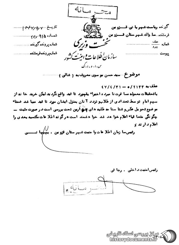 با تحقیقات معموله مسافرت نامبرده اخیراً به قم مورد تایید واقع نگردید لیکن خرید خانه از سهم امام توسط تعدادی از طلاب و تردد آنان به منزل ایشان مورد تایید میباشد ضمناً موضوع تحویل عکس و شناسنامه طلبههای سردارین1 تحت بررسی است در صورت مثبت چگونگی متعاقباً اعلام خواهد شد خواهشمند است هرگونه اطلاعات مکتسبه بعدی را اعلام دارند.