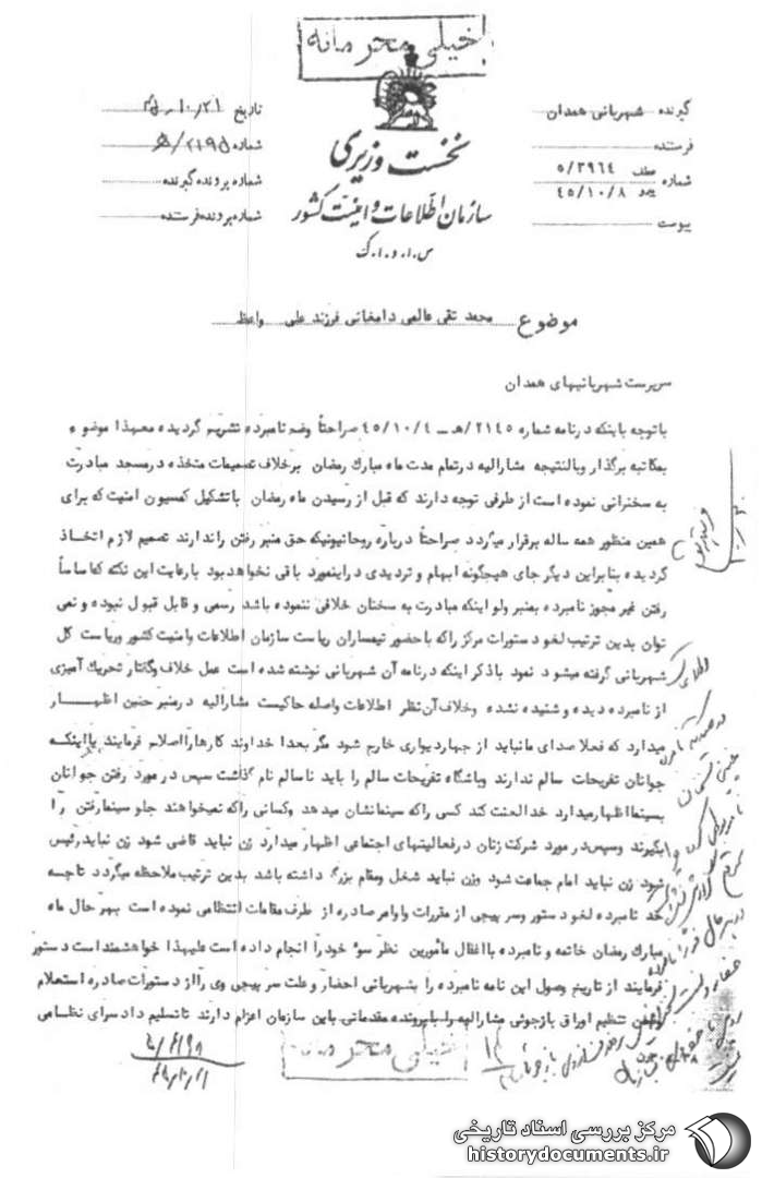 با توجه به اینکه در نامه شماره ۲۱4۵/ ﻫ - 4 /10 /45 صراحتاً وضع نامبرده تشریح گردیده معهذا موضوع به مکاتبه برگزار و بالنتیجه مشارالیه در تمام مدت ماه مبارک رمضان برخلاف تصمیمات متخذه در مسجد مبادرت به سخنرانی نموده است از طرفی توجه دارند که قبل از رسیدن ماه رمضان با تشکیل کمیسیون امنیت که برای همین منظور همهساله برقرار میگردد صراحتاً درباره روحانیونی که حق منبر رفتن را ندارند تصمیم لازم اتخاذ گردیده بنابراین دیگر جای هیچگونه ابهام و تردیدی در این مورد باقی نخواهد بود با رعایت این نکته که اساساً رفتن غیر مجوز نامبرده به منبر و لو اینکه مبادرت به سخنان خلافی ننموده باشد رسمی و قابل قبول نبوده و نمیتوان بدین ترتیب لغو دستورات مرکز را که با حضور تیمساران ریاست سازمان اطلاعات و امنیت کشور و ریاست کل شهربانی گرفته میشود نمود با ذکر اینکه در نامه آن شهربانی نوشته شده است عمل خلاف و گفتار تحریکآمیزی از نامبرده دیده و شنیده نشده و خلاف آن نظر اطلاعات واصله حاکیست مشارالیه در منبر چنین اظهار میدارد که فعلاً صدای ما نباید از چهار دیواری خارج شود مگر بعداً خداوند کارها را اصلاح فرمایند یا اینکه جوانان تفریحات سالم ندارند و باشگاه تفریحات سالم را باید ناسالم نام گذاشت سپس در مورد رفتن جوانان به سینما اظهار میدارد خدا لعنت کند کسی را که سینما نشان میدهد و کسانی را که نمیخواهند جلو سینما رفتن را بگیرند و سپس در مورد شرکت زنان در فعالیتهای اجتماعی اظهار میدارد زن نباید قاضی شود زن نباید رئیس شود زن نباید امام جماعت شود و زن نباید شغل و مقام بزرگ داشته باشد بدین ترتیب ملاحظه میگردد تا چه حد نامبرده لغو دستور و سرپیچی از مقررات و اوامر صادره از طرف مقامات انتظامینموده است به هر حال ماه مبارک رمضان خاتمه و نامبرده با اغفال مأمورین نظر سوء خود را انجام داده است علیهذا خواهشمند است دستور فرمایند از تاریخ وصول این نامه نامبرده را به شهربانی احضار و علت سرپیچی وی را از دستورات صادره استعلام و ضمن تنظیم اوراق بازجویی مشارالیه را با پرونده مقدماتی به این سازمان اعزام دارند تا تسلیم دادسرای نظامیشود در حالی که مشارالیه میتوانست بدون سرپیچی از مقررات و دستورات صادره مقامات انتظامی با یک مراجعه کوتاه و تسلیم تقاضا و اظهار ندامت به راحتی از منبر استفاده نموده باشد.