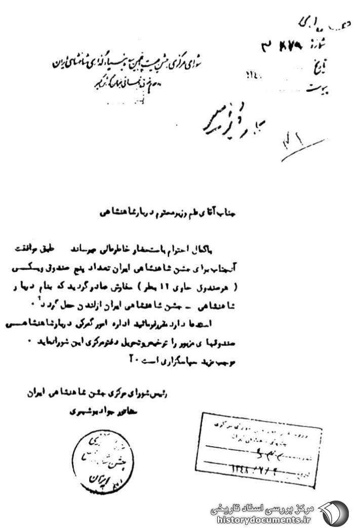 با کمال احترام به استحضار خاطر عالی میرساند طبق موافقت آن جناب برای جشن شاهنشاهی ایران تعداد پنج صندوق ویسکی (هر صندوق حاوی ۱۲ بطر) سفارش صادر گردید که به نام دربار شاهنشاهی - جشن شاهنشاهی ایران از لندن حمل گردد.*