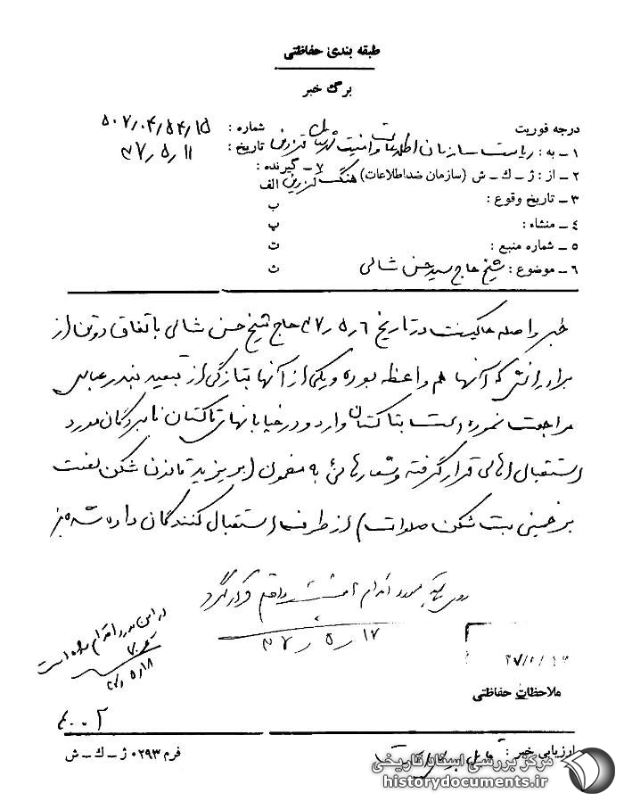 خبر واصله حاکیست در تاریخ 6 / 5 / 37 حاج شیخ حسن شالی به اتفاق دو تن از برادرانش که آنها هم واعظ بوده و یکی از آنها به تازگی از تبعید بندرعباس مراجعت نموده است به تاکستان وارد و در خیابانهای تاکستان نامبردگان مورد استقبال اهالی قرار گرفته و شعارهایی به مضمون (بر یزید قانونشکن لعنت بر خمینی بتشکن صلوات) از طرف استقبالکنندگان داده شده.