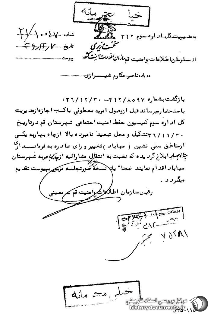 به استحضار میرساند قبل از وصول امریه معطوفی با کسب اجازه از مدیریت کل اداره سوم کمیسیون حفظ امنیت اجتماعی شهرستان قم در تاریخ 3 /11 /36 تشکیل و محل تبعید نامبرده بالا از چاهبهار به یکی از مناطق سنی نشین (مهاباد) تغییر و رأی صادره به فرمانداری چاهبهار ابلاغ گردیده که نسبت به انتقال مشارالیه از چاهبهار به شهرستان مهاباد اقدام نمایند. ضمناً یک نسخه فتوکپی صورتجلسه مزبور به پیوست1 تقدیم میگردد.