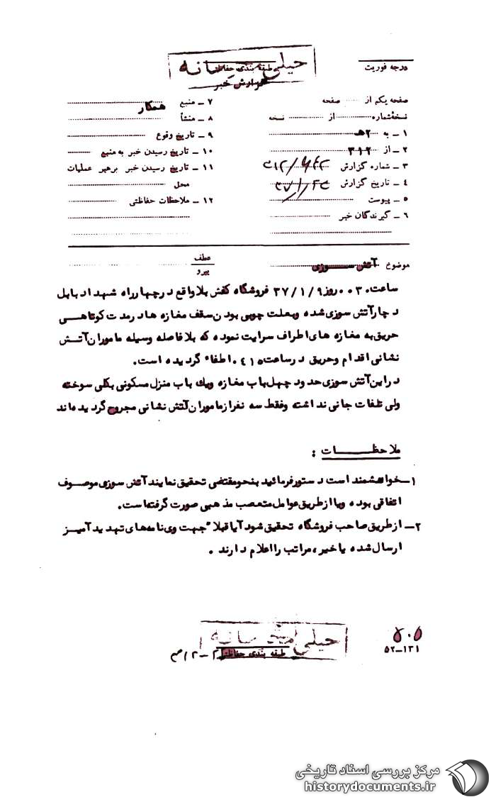 1ـ خواهشمند است دستور فرمایید به نحو مقتضی تحقیق نمایند آتشسوزی موصوف اتفاقی بوده و یا از طریق عوامل متعصّب مذهبی صورت گرفته است؛