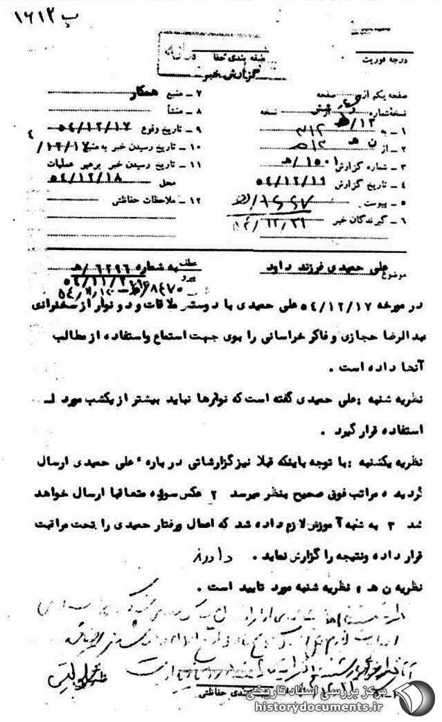 در مورخه 17 /12 /54 علی حمیدی با دوستش ملاقات و دو نوار از سخنرانی عبدالرضا حجازی و فاکر خراسانی را به وی جهت استماع و استفاده از مطالب آنها داده است.
