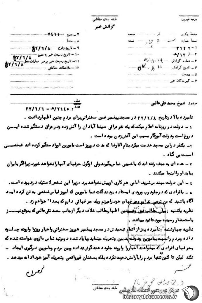 نامبرده بالا در تاریخ 8 /6 /37 در مسجد پیغمبر ضمن سخنرانی برای مردم چنین اظهار داشت.
