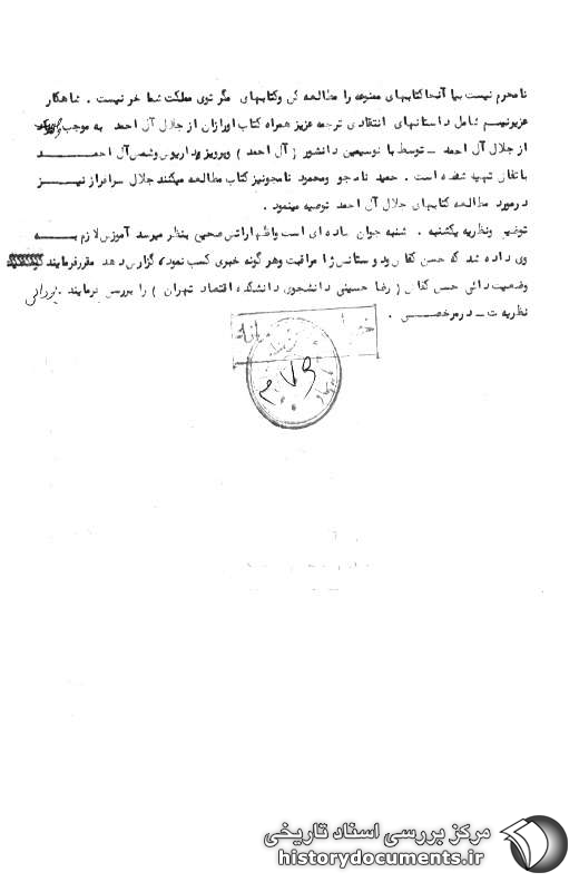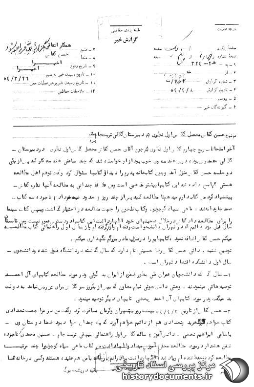 3. حسن کفاش از تاریخ 3 /4 /54 بیست روز به تهران و کرمان مسافرت کرد و گفت من در مراجعت تعدادی کتاب خواهم خرید و تعدادی هم از داییام خواهم آورد که یک چمدان خواهد بود. ضمناً دوستان وی به اسامی ابراهیم نخعی، دانشآموز 2 ساله کلاس اول راهنمایی بیهقی تربت جام، حسین محمدی که نامبرده ضمن هشدار در مورد مطالعه مخفی آموزش میداد و اظهار داشت من کتاب «ماهی سیاه کوچولو» را چند مرتبه مطالعه کرده و حفظ کرده و حفظ شدهام و یادشده اظهار داشت برادرانم در خانه با من هم عقیده هستند و کسی در خانه ما نامحرم نیست؛ بیا آنجا کتابهای ممنوعه را مطالعه کن و کتابهای «مگر توی مملکت شما خر نیست» شاهکار عزیرنسیم شامل داستانهای انتقادی ترجمه رضا1 همراه کتاب «اورازان» از جلال آلاحمد به موجب وصیت از جلال آلاحمد توسط بانو سیمین دانشور2 (آلاحمد) و پرویز و داریوش و شمس آلاحمد3 بهاتفاق تهیه شده است. حمید نامجو و محمود نامجو نیز کتاب مطالعه میکنند. جلال سرافراز نیز در مورد مطالعه کتابهای جلال آلاحمد توصیه مینمود.