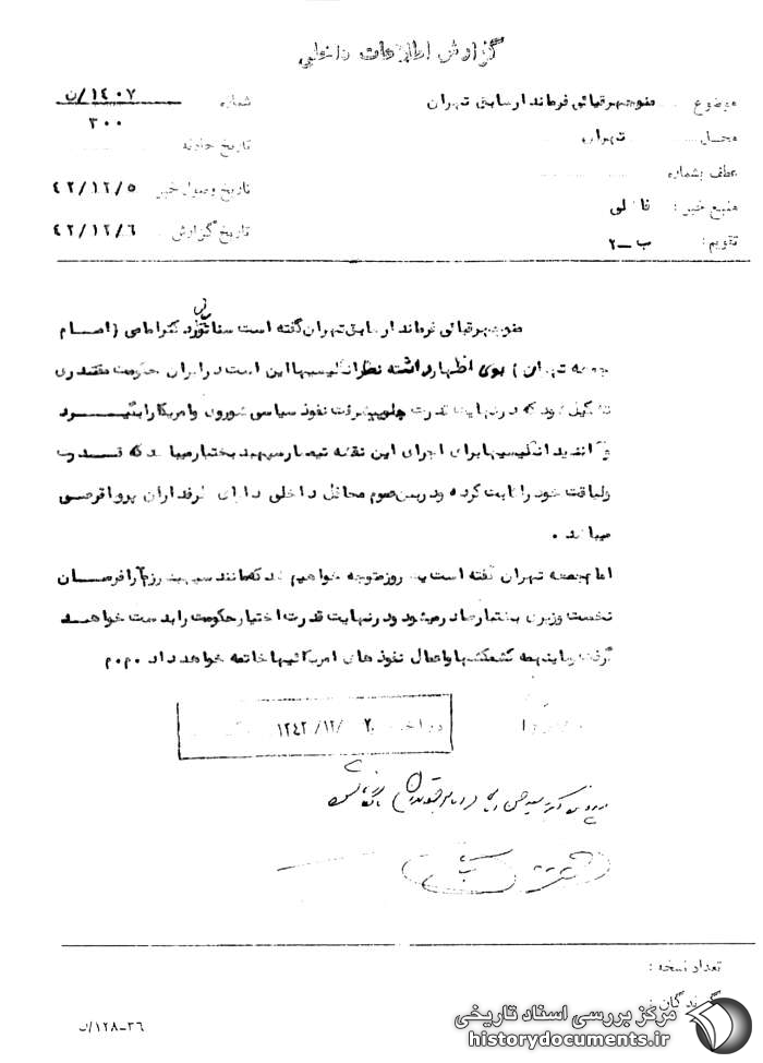امام جمعه تهران گفته است: یک روز متوجه خواهیم شد که مانند سپهبد رزمآرا، فرمان نخست وزیری بختیار صادر میشود و در نهایت قدرت اختیار حکومت را به دست خواهد گرفت و به این همه کشمکشها و اعمال نفوذهای آمریکائیها خاتمه خواهد داد.