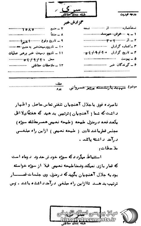 نامبرده فوق با جلال آهنچیان تلفنی تماس حاصل و اظهار داشت که شما (آهنچیان) ترتیبی بدهید که هفتهای لااقل یک دفعه در منزل ملیحه (ملیحه نعیمی همسر مطلقه سوژه) مجلس قمار باشد تا وی (ملیحه نعیمی) از این راه مبلغی درآمد داشته باشد.