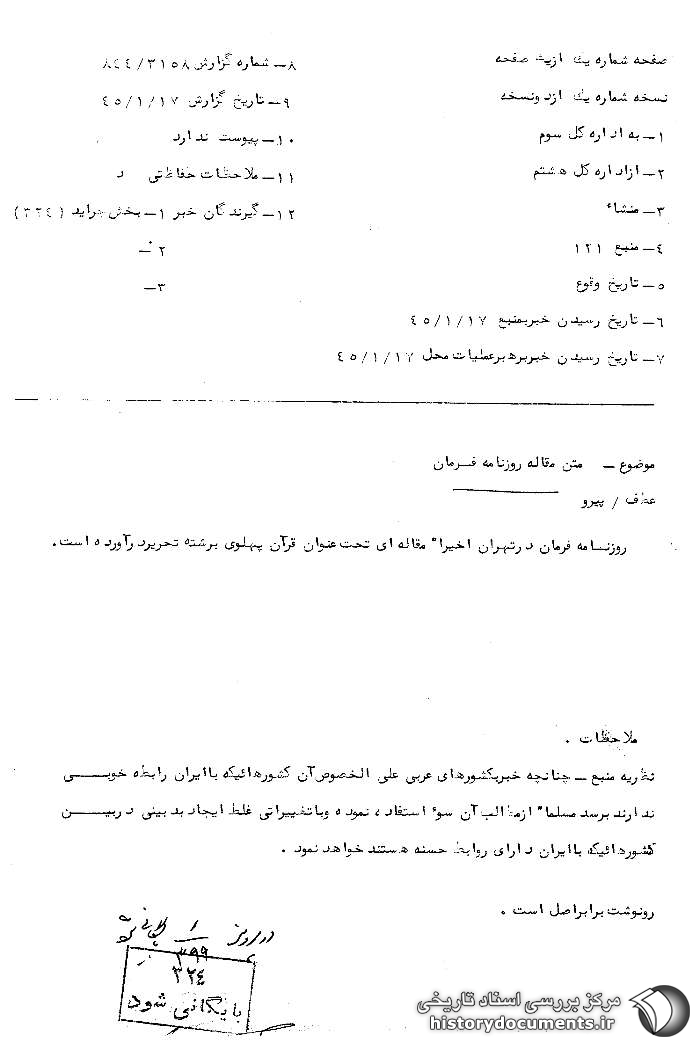 روزنامه فرمان در تهران اخیرا مقاله ای تحت عنوان قرآن پهلوی به رشته