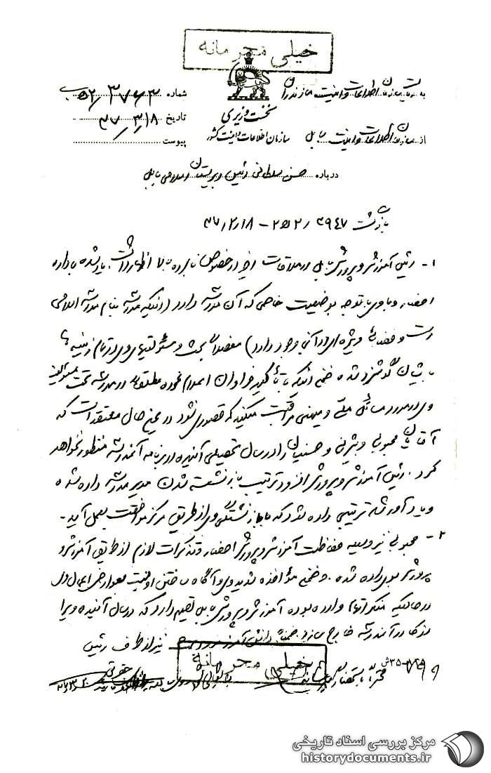 2- محبوبی نیز وسیله حفاظت آموزش و پرورش احضار و تذکرات لازم از طریق آموزش و پرورش به وی داده شده و ضمن مؤاخذه شدید وی و آگاه ساختن او نسبت به عوارض اعمال وی در حالی که منکر اتهام وارده بوده آموزش و پرورش بابل تصمیم دارد که در سال آینده وی را از کادر آن مدرسه خارج سازد. ضمناً دانشآموز مورد بحث نیز از طرف رئیس آموزش و پرورش دلجوئی و در خصوص احساسات ملّی و میهنی از وی تقدیر و تشویق به عمل آمده است محترماً به استحضار میرساند.