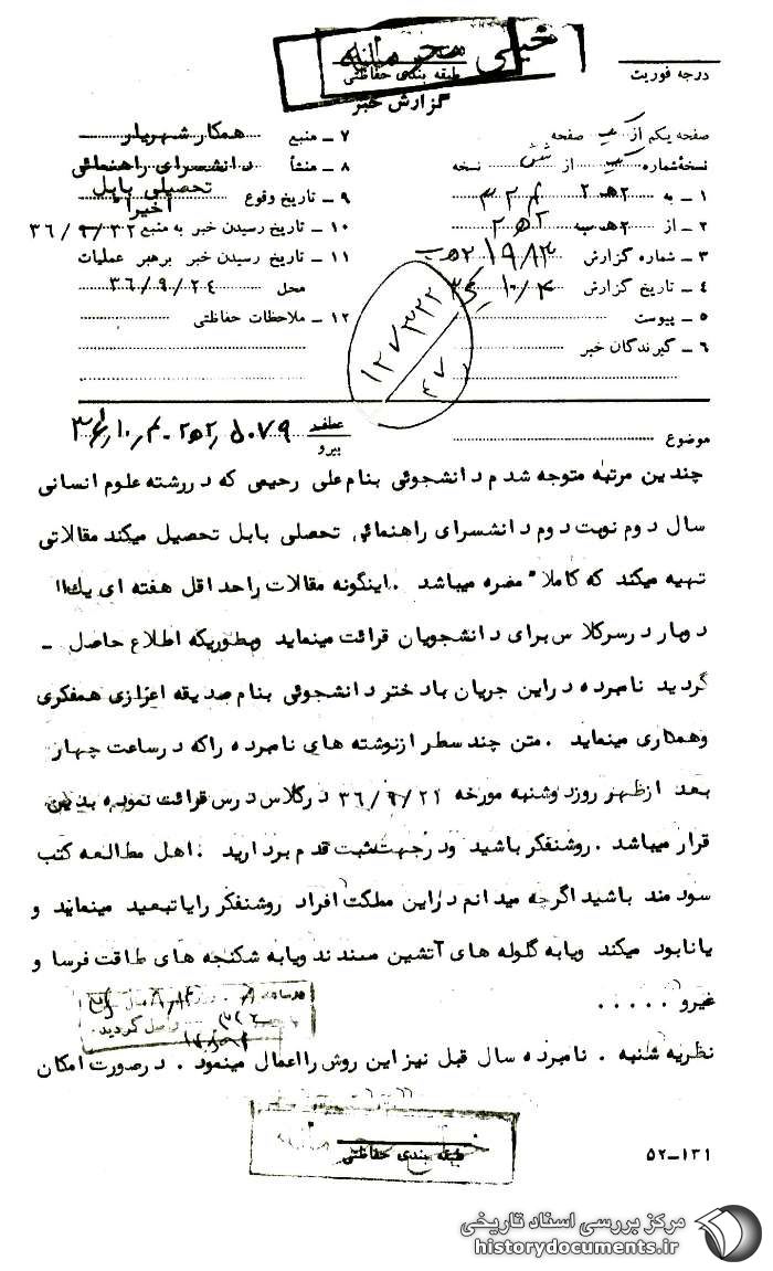 چندین مرتبه متوجه شدم دانشجویی به نام علی رحیمی1 که در رشته علوم انسانی سال دوم نوبت دوم دانشسرای راهنمایی تحصیلی بابل تحصیل میکند مقالاتی تهیه میکند که کاملاً مضرّه میباشد. اینگونه مقالات را حداقل هفتهای یک الی دو بار در سر کلاس برای دانشجویان قرائت مینماید و بطوریکه اطلاع حاصل گردید نامبرده در این جریان با دختر دانشجویی به نام صدیقه اعزازی2 همفکری و همکاری مینماید. متن چند سطر از نوشتههای نامبرده را که در ساعت چهار بعد از ظهر روز دوشنبه مورخه 21 /9 /36 درکلاس درس قرائت نموده بدین قرار میباشد: روشنفکر باشید و در جهت مثبت قدم بردارید. اهل مطالعه کتب سودمند باشید اگرچه میدانم در این مملکت افراد روشنفکر را یا تبعید مینمایند و یا نابود میکنند و یا به گلولههای آتشین میبندند و یا شکنجههای طاقتفرسا و غیره.
