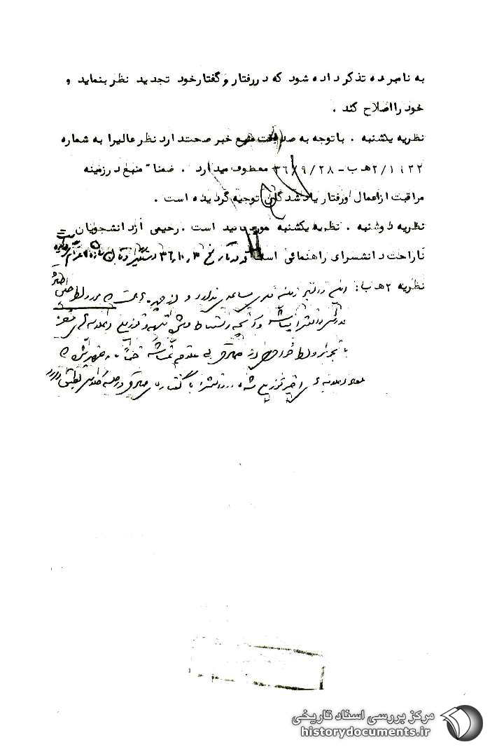 نظریه 2 ﻫ ب: این دانشجو زمینه فکری مساعدی ندارد و از چهرههایی است که مورد نظر حسین صادقی4 مدرّس دانشسرا میباشد و آنچه استنباط میشود تهیه و توزیع اعلامیههای مضرّه با تجویز و نظرخواهی از صادقی بیعلاقه نمیباشد. ضمناً باید [ناخوانا] شود که مفاد اعلامیههای اخیر توزیع شده در دانشسرا با گفتارهای صادقی در جلسهی کلاس تطبیق دارد.