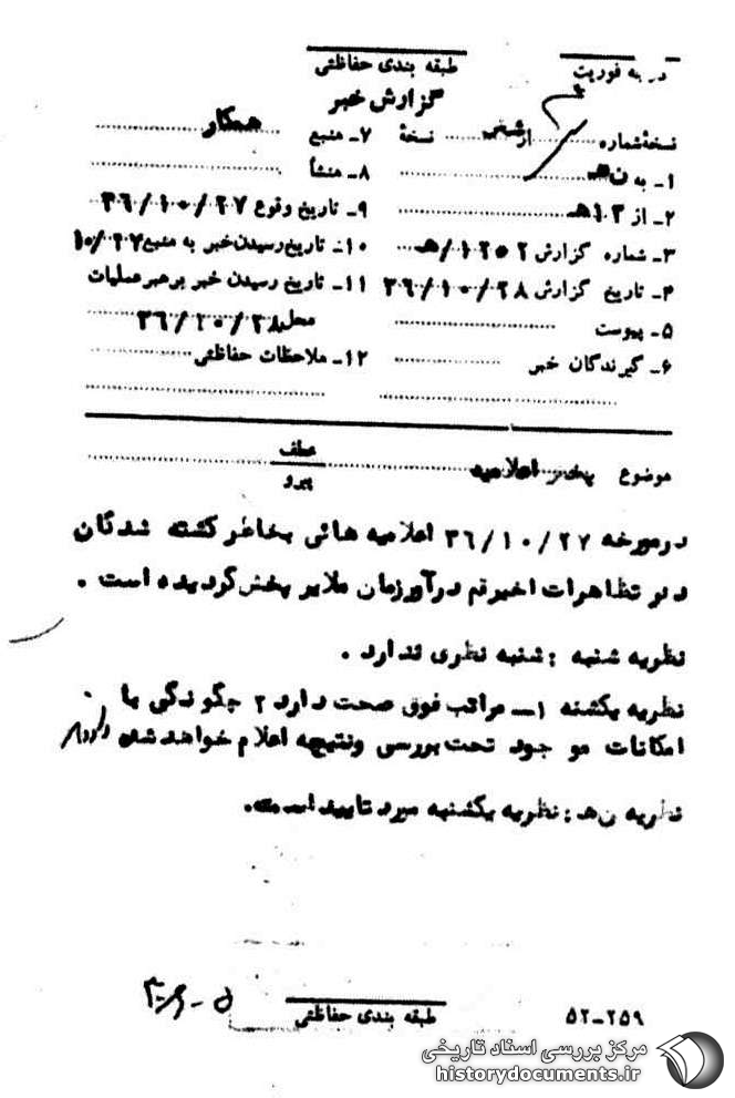 در مورخه 27 /10 /36 اعلامیههایی بخاطر کشته شدگان در تظاهرات اخیر قم در آور زمان ملایر پخش گردیده است.