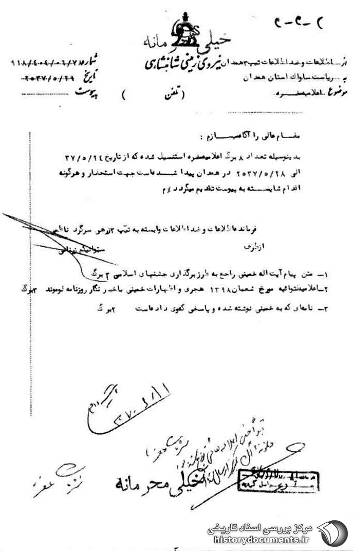 بدینوسیله تعداد ۸ برگ اعلامیه مضره استنسیل شده که از تاریخ 24 /5 /37 الی 28 /5 /37 در همدان پیدا شده است جهت استحضار و هر گونه اقدام شایسته به پیوست تقدیم میگردد /