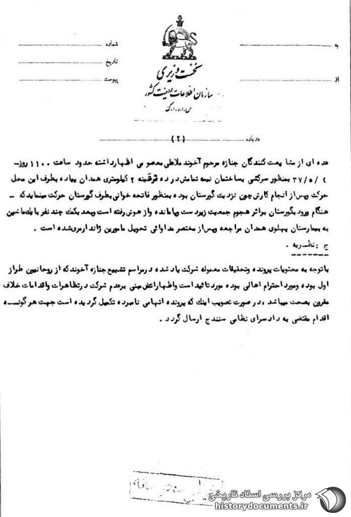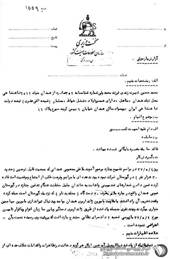 روز 4 /5 /37 در مراسم تشییع جنازه مرحوم آخوند ملاعلی معصومی همدانی که جمعیت قابل توجهی (حدود ۳۰ هزار نفر) در گورستان شرکت داشتند عدهای ماجراجو و فرصت طلب از اجتماع و موقعیت استفاده کرده و ضمن دادن شعارهای ضد میهنی و اهانت به خاندان جلیل سلطنت هنگام تدفین جنازه در گورستان عمومی همدان واقع در ابتدای جاده ملایر به طرف ۳۰ دستگاه (محله بدنام) که نزدیک گورستان است حمله و قصد تخریب آن را داشتند که با مقاومت مأمورین ژاندارمری همدان مواجه و به دنبال تیراندازی مهاجمین متواری- و چند نفر منجمله یاد شده دستگیر و به این سازمان اعزام و با قرار تأمین مورخ 9 /5 /37 بازپرستی شعبه ۲- دادسرای نظامی سنندج بازداشت که قرار صادره به رویت وی رسیده نسبت به آن اعتراضی ننموده است.