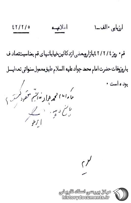 قم. روز 4 /2 /42 بازار و بعضی از دکاکین خیابانهای قم به مناسبت تصادف با روز وفات حضرت امام محمدجواد علیهالسلام طبق معمول سنواتی تعطیل بوده است.