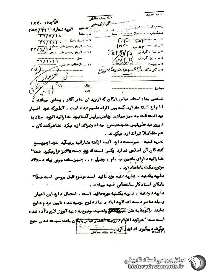 شخصی به نام استاد عباس بابکان که از مریدان خاص آقای روحانی میباشد اظهار داشت مقداری کلت بین افراد تقسیم شده است. آنطور که خود اظهار میداشت کلت چه چیز میباشد و نامش برایش آشنا نبود مشارالیه افزود چنانچه در روز عید فطر پلیس خشونت به خرج میداد و تیراندازی میکرد تظاهرکنندگان هم متقابلاً تیراندازی میکردند.