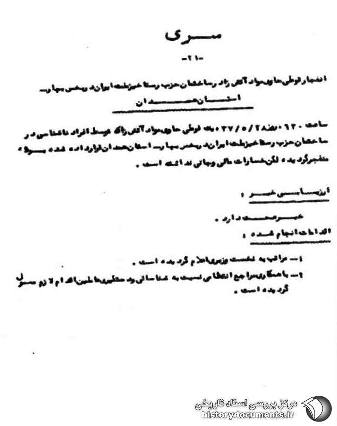 ساعت ۰6۳۰ روز 28 /5 /37، یک قوطی حاوی مواد آتشزا که توسط افراد ناشناسی در ساختمان حزب رستاخیز ملت ایران در بخش بهار- استان همدان قرار داده شده بود، منفجر گردیده لکن خسارات مالی و جانی نداشته است.