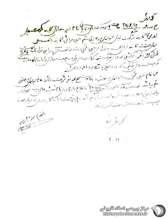 صبح روز جمعه مورخ 24 /6 / 37 ساعت 9 بود که عدهای آقایان به نام امیر مرادی کارمند شرکت تیدی، احمد محمدیان کارمند شرکت تیدی، سید مهدی پورصادق معلّم، حسین میراثی کارمند بانک ملّی، مهدی حقیقت کارمند قرضالحسنه به منزل آقای حسین حجتی رفته و توقف آنها در این منزل تا ساعت 11:45 طول کشید و ضمن برگشتن عدهای به طرف قصّابکلا و عدهای به طرف چیتسازی به راه افتاده و در دست هر یک بستههای پلی کپی که در داخل پوشه بود با خود داشته[اند]. ضمناً خانم حسین حجتی و سیدمهدی پورصادق در تظاهرات صبح عید فطر شرکت داشته، خانم سیدمهدی پورصادق معلّم میباشد اضافه میشود که تا امروز شنبه مورخ 25 /6/ 37 که اطلاع دارم روی تمام شیشههای درب مسجد بزرگ چاله زمین اعلامیه نصب شده است و در کوچه سنگپل پشت اداره کار در روی دو دیوار سمت چپ و راست نوشته است مرگ بر شاه.
