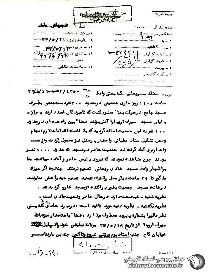ساعت 1405 روز جاری جمعیتی در حدود 300 نفر دستهجمعی به طرف مسجد جامع در حرکت بعداً معلوم گشت که نامبردگان قصد دارند پس از پایان مسجد، سیرک اروپا را آتش بزنند ضمناً بین راه عدهای در حدود 100 نفر به این جمعیت اضافه گردید که بلافاصله اقدامات لازم آنجام و ضمن تشکیل ستاد عملیاتی و احضار پرسنل نیز معمول گردید و از ژاندارمری کمک گرفته شد جمعیت حاضر در مسجد که حدود 1000 نفر بودند چون مشاهده نمودند که نیروی پلیس حاضر و آماده میباشند بنا براظهار واعظ مسجد هادی روحانی تصمیم گرفتند چنانچه اگر سیرک مذکور تا 24 ساعت دیگر محل را ترک ننماید تصمیم خود را عملی نمایند در خاتمه مسجد جمعیت به طور پراکنده از مسجد خارج گردیدند.1