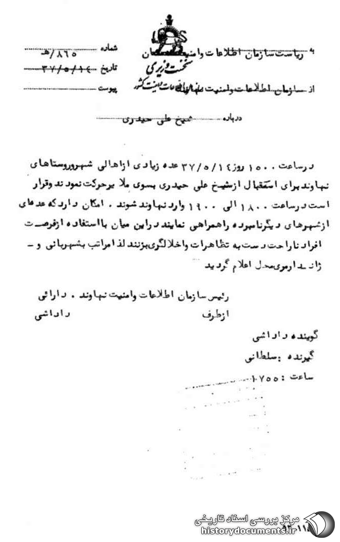 در ساعت ۱۵ روز 14 /5 /37 عده زیادی از اهالی شهر و روستاهای نهاوند برای استقبال از شیخ علی حیدری به سوی ملایر حرکت نمودند و قرار است در ساعت ۱۸ الی ۱۹ وارد نهاوند شوند. امکان دارد که عدهای از شهرهای دیگر نامبرده را همراهی نمایند در این میان با استفاده از فرصت افراد ناراحت دست به تظاهرات و اخلالگری بزنند لذا مراتب به شهربانی و ژاندارمری محل اعلام گردید.