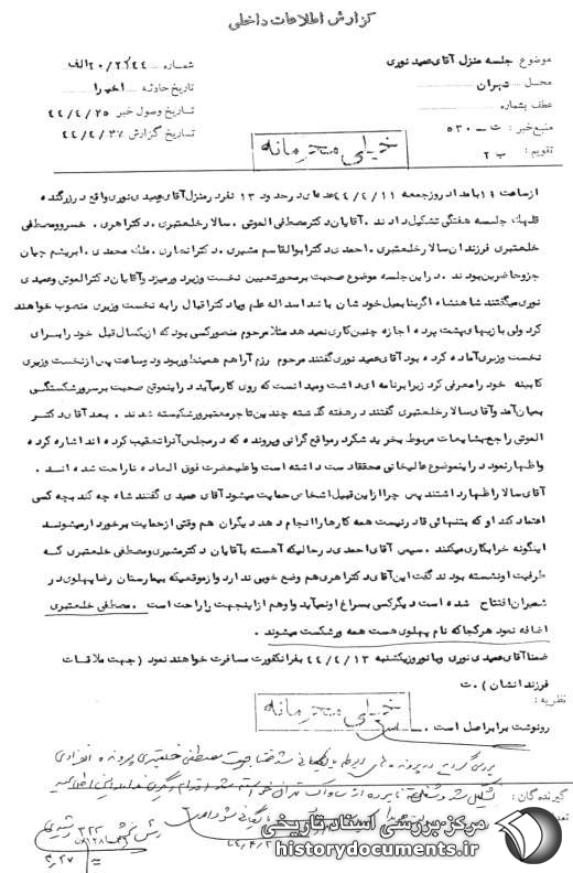 بررسی گردید در پروندههای مربوطه بایگانی شد ضمناً جهت مصطفی خلعتبری پرونده انفرادی تشکیل شد و شغل نامبرده از ساواک تهران خواسته شد اقدام دیگری ندارد این اطلاعیه در پرونده دولت هویدا به کلاسه د ـ 468، بایگانی شود. 27 /4 /44
