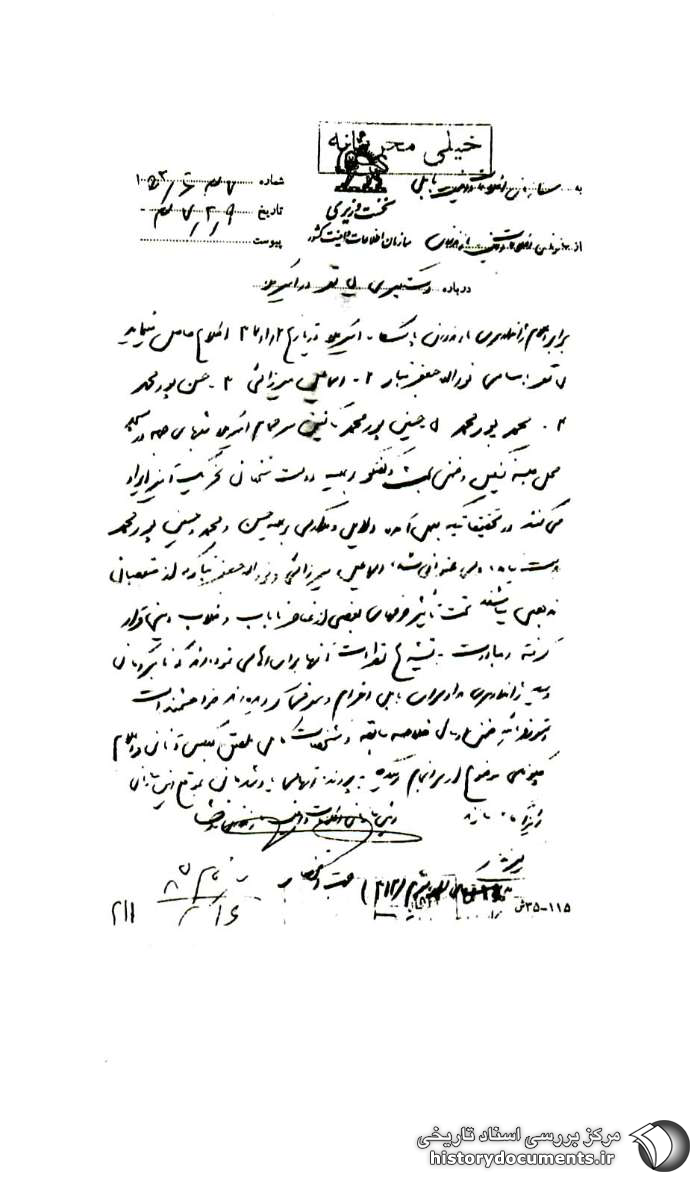 برابر اعلام ژاندارمری مازندران پاسگاه امیرکلا در تاریخ 2 /1 /37 اطلاع حاصل مینماید 5 نفر به اسامی 1- نورالله جعفرتبار 2- اسماعیل میرزایی 3- حسن پورمحمد 4- محمد پورمحمد 5- حسین پورمحمد ساکنین سرحمام امیرکلا شبهای جمعه در مسجد محل، جلسه تشکیل و ضمن بحث و گفتگو برعلیه دولت سخنان تحریکآمیز ایراد میکنند در تحقیقاتی که به عمل آمده دلایل و مدارکی برعلیه حسن و محمد و حسین پورمحمد به دست نیامده ولی عنوان شده اسماعیل میرزایی و نورالله جعفرتبار که از متعصّبان مذهبی میباشند تحت تأثیر حرفهای بعضی از عناصر ناباب و طلّاب دینی قرار گرفته و مبادرت به تشریح نظرات آنها برای اهالی نمودهاند که نامبردگان وسیله ژاندارمری به دادسرای بابل اعزام و معرفی گردیدهاند خواهشمند است دستور فرمایید ضمن ارسال خلاصه سابقه و مشخصات کامل ملصق به عکس آنان و اعلام چگونگی موضوع از سرآنجام رسیدگی به پرونده اتهامی یادشدگان به موقع این سازمان را نیز آگاه سازند.