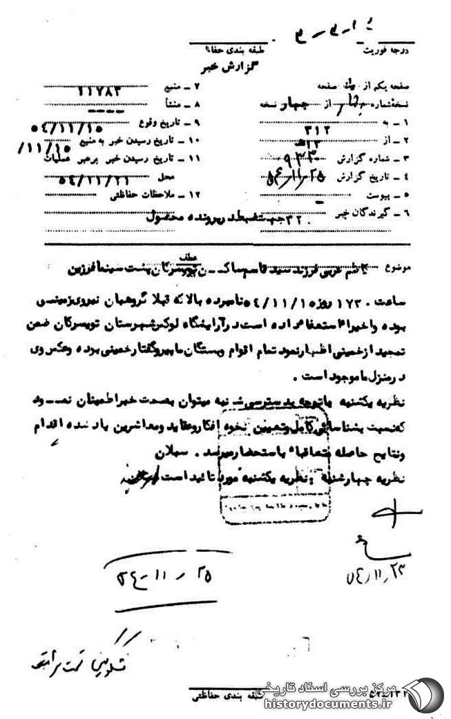 ساعت ۱۷:۳۰ روز 10 /11 /54 نامبرده بالا که قبلاً گروهبان نیروی زمینی بوده و اخیراً استعفا داده است در آرایشگاه لوکس شهرستان تویسرکان ضمن تمجید از خمینی اظهار نمود تمام اقوام و بستگان ما پیرو گفتار خمینی بوده و عکس وی در منزل ما موجود است.