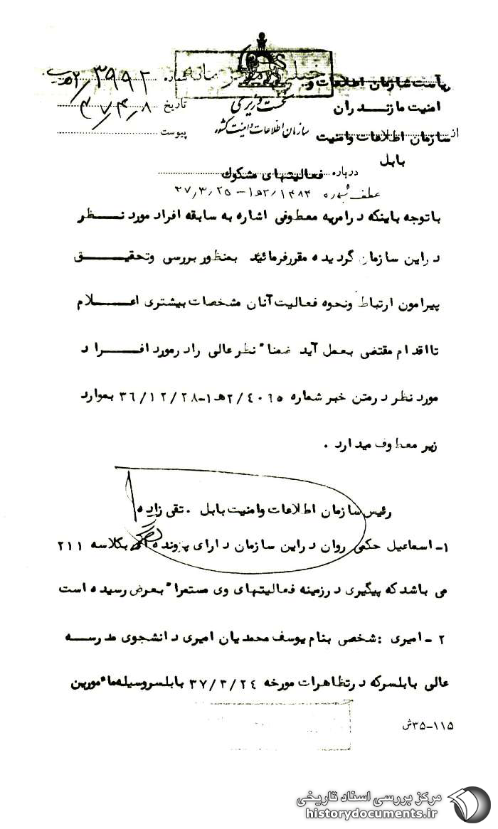 2- امیری: شخصی به نام یوسف محمدیان امیری1 دانشجوی مدرسه عالی بابلسرکه در تظاهرات مورخه 24 /3 / 37 بابلسر وسیلهی مأمورین شهربانی دستگیر که مراتب طی شماره 3921 / 2ﻫ ب – 1 / 4/ 37 قبلاً به استحضار رسیده است.