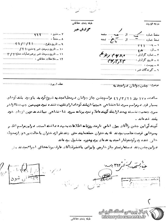 ساعت 1750 روز 21 /3 /46 مراسم جشن جاز جوانان در محل امجدیه شروع گردید با وجود بلندگوهای بسیار قوی در مراسم سرود شاهنشاهی هیچ یک از بلندگوها دارای تقویتکننده نبوده و به همین جهت تا اواخر سرود جمعیت نشسته و بعد از این که گوینده اعلام نمود برنامه سرود شاهنشاهی میباشد مدعوین از جای خود بلند شدهاند.