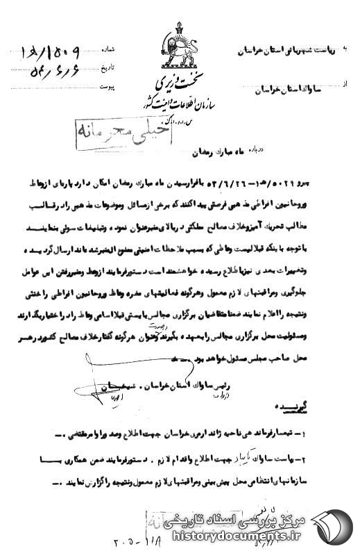 با فرا رسیدن ماه مبارک رمضان، امکان دارد پارهای از وعاظ و روحانیون افراطی مذهبی فرصتی پیدا کنند که برخی از مسائل و موضوعات مذهبی را در قالب مطالب تحریکآمیز و خلاف مصالح مملکتی در بالای منبر عنوان نموده و تبلیغات سوئی بنمایند. باتوجه به اینکه قبلاً لیست وعاظی که به سبب ملاحظات امنیتی ممنوعالمنبر شدهاند ارسال گردیده و تغییرات بعدی نیز به اطلاع رسیده، خواهشمند است دستور فرمایند از وعظ و منبر رفتن این عوامل جلوگیری و مراقبتهای لازم معمول و هرگونه فعالیتهای مضره وعاظ و روحانیون افراطی را خنثی و نتیجه را اعلام نمایند. ضمناً متقاضیان برگزاری مجالس بایستی قبلاً اسامی وعاظ را در اختیار بگذارند و مسئولیت محل برگزاری مجالس را به عهده بگیرند و در صورت عنوان هرگونه گفتار خلاف مصالح کشور در هر محل، صاحب مجلس مسئول خواهد بود.