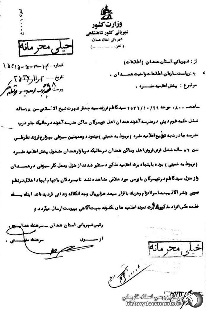 ساعت ۸ مورخه 29 /10 /2536 سید کاظم فرزند سید جعفر شهرت شیخلاسلامی سن ۱۸ ساله شغل طلبه علوم دینی در مدرسه آخوند همدان اهل تویسرکان ساکن مدرسه آخوند در حالی که جلو درب مدرسه مبادرت به توزیع اعلامیه مضره (مربوط به خمینی) مینموده و همچنین سبزعلی به زراع فرزند نظرعلى سن ۵6 ساله شغل فرش فروش اهل و ساکن همدان در حالی که در بازار همدان مشغول پخش اعلامیه مضره (مربوط به خمینی) بوده با پنجاه برگ اعلامیه مذکور دستگیر شدند از منزل و محل کار سبزعلى در همدان و از منزل سید کاظم در تویسرکان بازرسی و خلافی مشاهده نشد نامبردگان به اتهام ایجاد اخلال در نظم عمومی و نشر اکاذیب بدادسرا اعزام و هریک با قرار سیصد هزار ریال وجه الکفافه زندانی گردیدهاند اینک یک قطعه عکس افراد مذکور و ۸ برگ نمونه اعلامیه مکشوفه جهت آگاهی به پیوست ارسال میگردد.