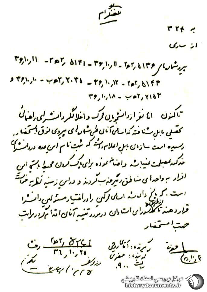 پیرو شمارههای 5136 /2ﻫ2- 11 /10 /36- 5141 /2ﻫ2- 11 /10 /36- 5143 /2ﻫ2- 2 /10 /36- 2035 /2ﻫ2- 10 /10 /36- 2153 /2ﻫ ب- 18 /10 /36