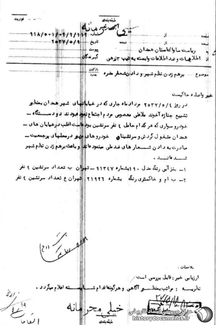 در روز 4 /5 /2537 مرداد ماه جاری که در خیابانهای شهر همدان به منظور تشیع جنازه آخوند ملاعلی معصومی مردم اجتماع نموده بودند دو دستگاه خودروی سواری که هرکدام حامل 4 سرنشین بوده اغلب در خیابانهای همدان مشغول گردش و سرنشینان خودروهای مزبور در محلهای پر جمعیت مبادرت به دادن شعارهای ضد ملی مینمودهاند و باعث برهم زدن نظم شهر شدهاند.