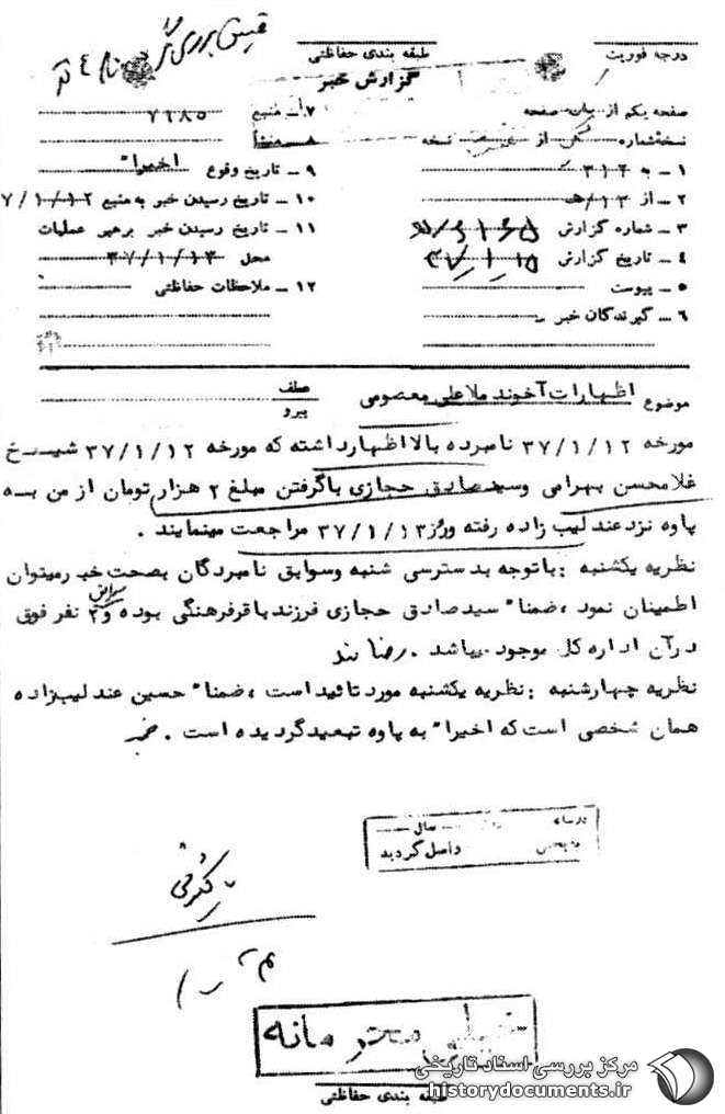 مورخه 12 /1 /37 نامبرده بالا اظهار داشته که مورخه 12 /1 /37 شیخ غلام حسن بهرامی و سید صادق حجازی با گرفتن مبلغ ۲ هزار تومان از من به پاوه نزد عندلیبزاده رفته و روز 13 /1 /37 مراجعت مینماید.