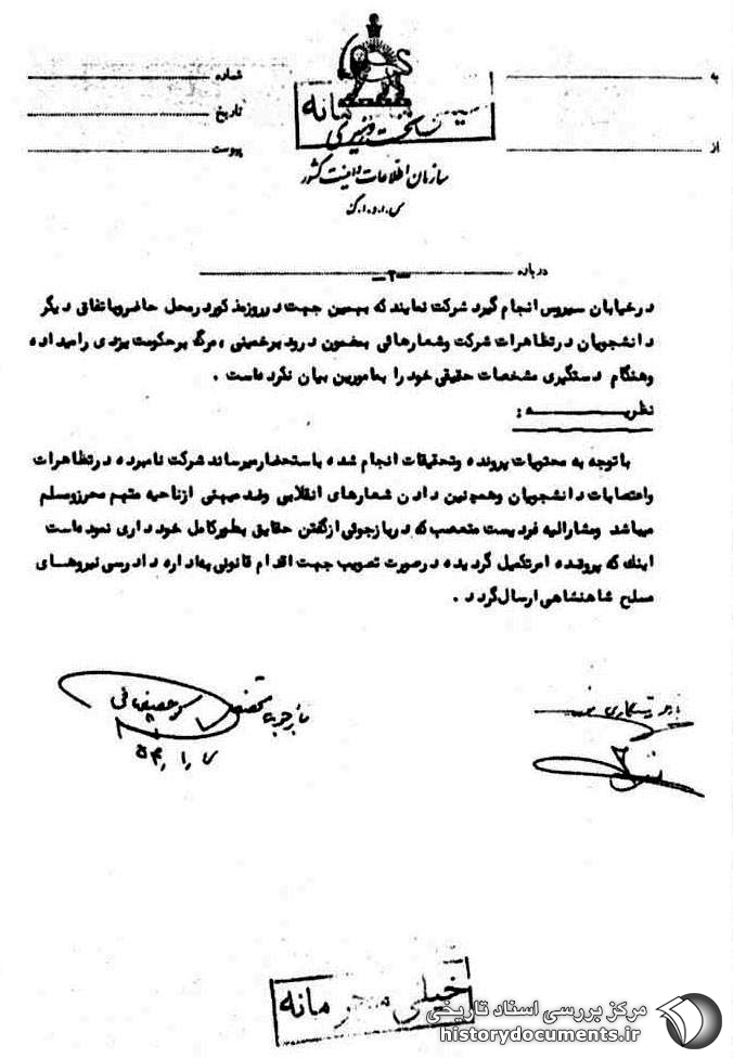با توجه به محتویات پرونده و تحقیقات انجام شده باستحضار میرساند شرکت نامبرده در تظاهرات و اعتصابات دانشجویان و همچنین دادن شعارهای انقلابی و ضد میهنی از ناحیه متهم محرز و مسلم میباشد و مشارالیه فردیست متعصب که در بازجویی از گفتن حقایق بطور کامل خودداری نموده است اینک که پرونده امر تکمیل گردیده در صورت تصویب جهت اقدام قانونی به اداره دادرسی نیروهای مسلح شاهنشاهی ارسال گردد.