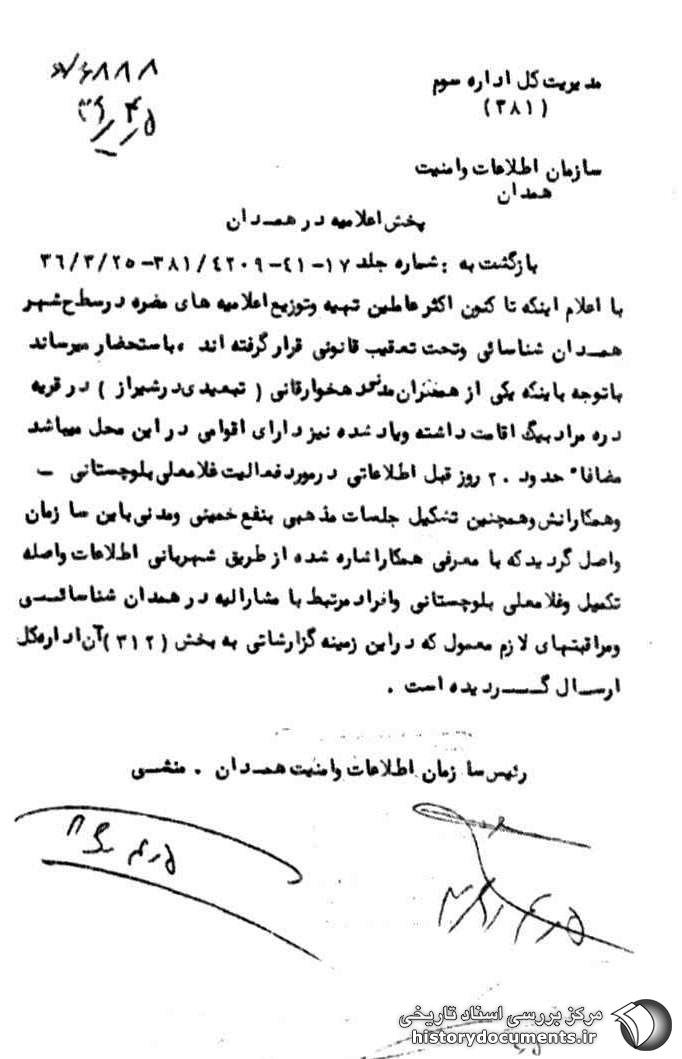 با اعلام اینکه تاکنون اکثر عاملین تهیه و توزیع اعلامیههای مضره در سطح شهر همدان شناسایی و تحت تعقیب قانونی قرار گرفتهاند، به استحضار میرساند با توجه به اینکه یکی از همفکران مدنی دهخوارقانی (تبعیدی در شیراز ) در قریه دره مرادبیگ اقامت داشته و یاد شده نیز دارای اقوامی در این محل میباشد مضافاً حدود ۲۰ روز قبل اطلاعاتی در مورد فعالیت غلامعلی بلوچستانی و همکارانش و همچنین تشکیل جلسات مذهبی به نفع خمینی و مدنی به این سازمان واصل گردید که با معرفی همکار اشاره شده از طریق شهربانی اطلاعات واصله تکمیل و غلامعلی بلوچستانی و افراد مرتبط با مشارالیه در همدان شناسایی و مراقبتهای لازم معمول که در این زمینه گزارشاتی به بخش (۳۱۲) آن اداره کل ارسال گردیده است.