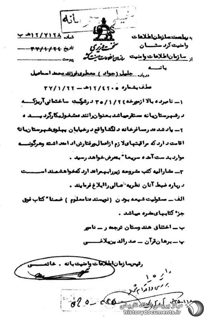 ۲- یاد شده در مسافرخانه دلگشا واقع در خیابان پهلوی شهرستان بانه اقامت دارد که مراقبتهای لازم از اعمال و رفتارش ادامه داشته و هرگونه موارد بدست آمده سریعاً به عرض خواهد رسید.