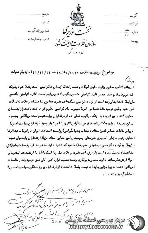 روی پرونده دکتر حسن ارسنجانی ضمیمه و بایگانی گردد مراتب در تاریخ 21 /1 /41 به دفتر ویژه اطلاعات منعکس گردیده است.