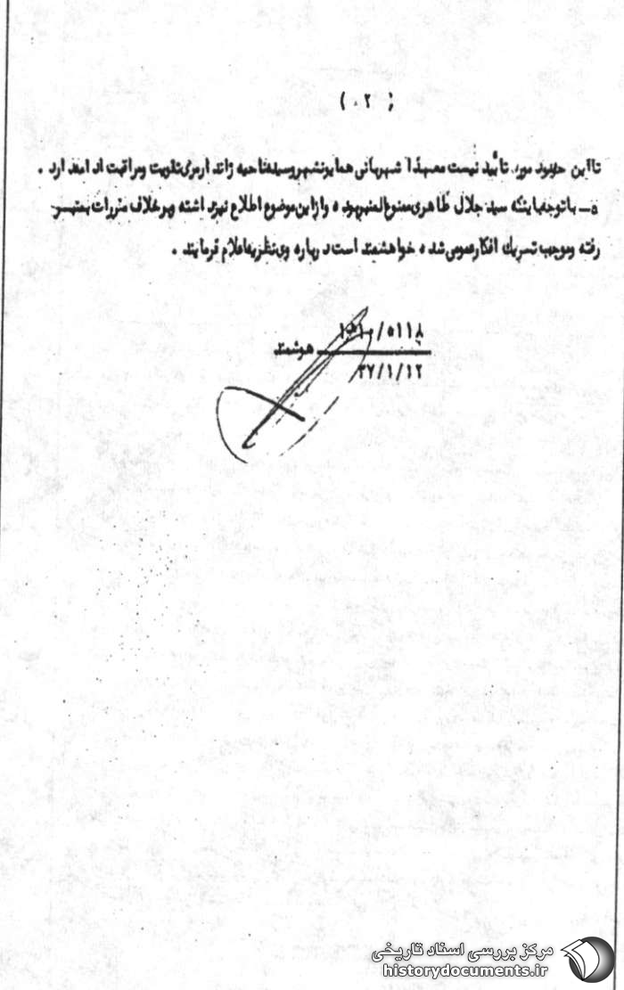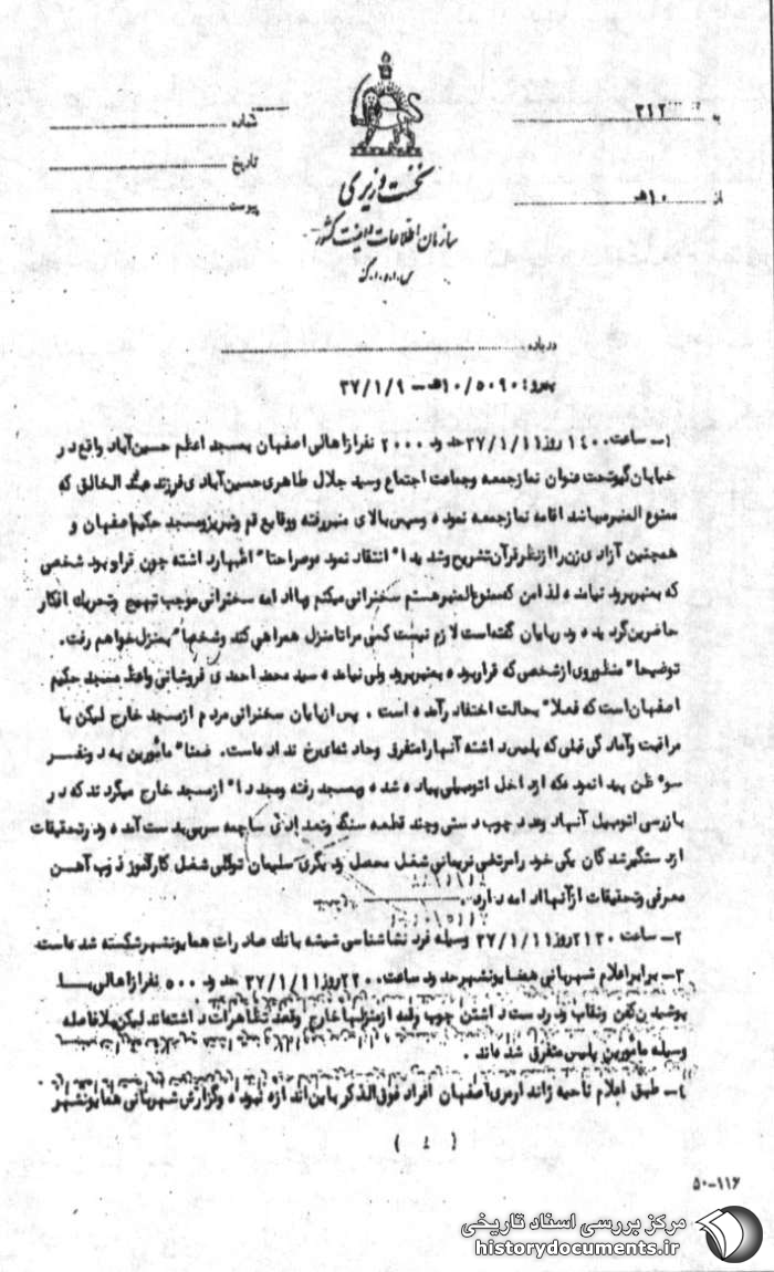 ۱- ساعت ۱۴۰۰ روز 11 /1 /37 حدود ۲۰۰۰ نفر از اهالی اصفهان به مسجد اعظم حسینآباد واقع در خیابان گیو، تحت عنوان نماز جمعه و جماعت اجتماع و سید جلال طاهری حسینآبادی فرزند عبدالخالق که ممنوعالمنبر میباشد، اقامه نماز جمعه نموده و سپس بالای منبر رفته و وقایع قم و تبریز و مسجد حکیم اصفهان و همچنین آزادی زن را از نظر قرآن تشریح و شدیداً انتقاد نموده و صراحتاً اظهار داشته: چون قرار بود شخصی که به منبر برود نیامده، لذا من که ممنوعالمنبر هستم سخنرانی میکنم و با ادامه سخنرانی موجب تهییج و تحریک افکار حاضرین گردیده و در پایان گفته است: لازم نیست کسی مرا تا منزل همراهی کند و شخصاً به منزل خواهم رفت. توضیحاً منظور وی از شخصی که قرار بوده به منبر برود ولی نیامده، سید محمد احمدی فروشانی واعظ مسجد حکیم اصفهان است که فعلاً به حالت اختفا درآمده است.