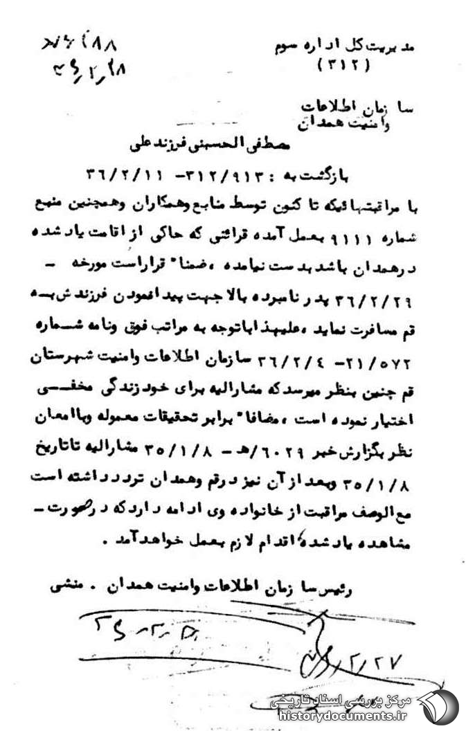 با مراقبتهایی که تاکنون توسط منابع و همکاران و همچنین منبع شماره ۹۱۱۱ به عمل آمده قرائنی که حاکی از اقامت یاد شده در همدان باشد به دست نیامده، ضمناً قرار است مورخه 29 /2 /36 پدر نامبرده بالا جهت پیدا نمودن فرزندش به قم مسافرت نماید، علیهذا با توجه به مراقبت فوق و نامه شماره 572 /21 – 4 /2 /36 سازمان اطلاعات و امنیت شهرستان قم چنین به نظر میرسد که مشارالیه برای خود زندگی مخفی اختیار نموده است، مضافاً برابر تحقیقات معموله و با امعان نظر بگزارش خبر 6029- ه- 8 /1 /35 مشارالیه تا تاریخ 8 /1 /35 و بعد از آن نیز در قم و همدان تردد داشته است معالوصف مراقبت از خانواده وی ادامه دارد که در صورت مشاهده یاد شده اقدام لازم به عمل خواهد آمد.