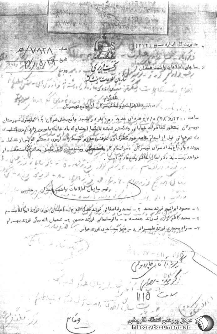 ساعت ۲۳ روز 28 /5 /37 عدهای حدد ۱۵۰ نفر در مسجد جامع بخش سرکان ۱۲ کیلومتری شهرستان تویسرکان به منظور تظاهرات خیابانی و شکستن شیشه بانکها اجتماع که با دخالت مأمورین ژاندارمری و شلیک یک تیر هوایی قبل از انجام مقاصد خود منصرف و ۸ نفر مشروحه زیر توسط ژاندامری دستگیر که پس از تشکیل پرونده و ارجاع دادسرای تویسرکان، سرانجام کار و مشخصات کامل مصلق بعکس آنها باستحضار خواهد رسید، در حال حاضر وضع عادی است.