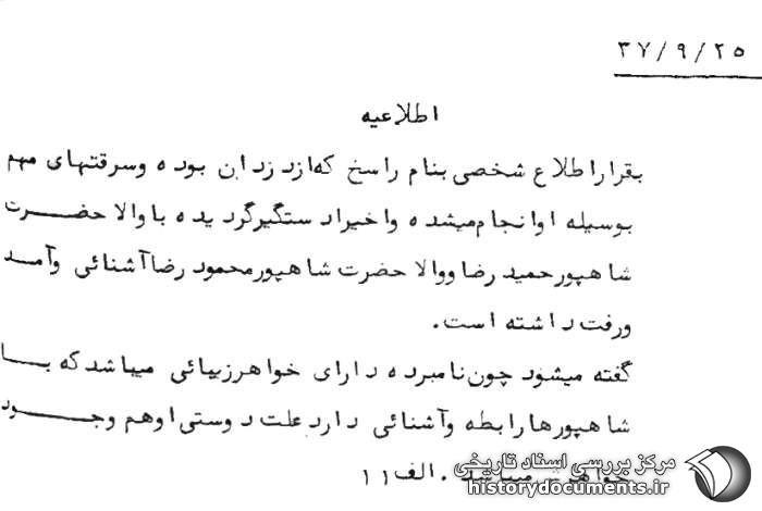 به قرار اطلاع شخصى به نام راسخ که از دزدان بوده و سرقتهای مهم به وسیله او انجام مىشده و اخیراً دستگیر گردیده با والاحضرت شاهپور حمید رضا و والاحضرت شاهپور محمودرضا آشنایى و آمد و رفت داشته است.