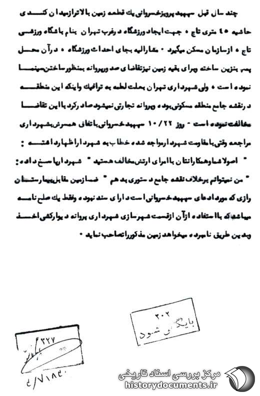 «اصولاً شما و همکارانتان با امرای ارتش مخالف هستید» شهردار پاسخ داده: «من نمیتوانم برخلاف نقشه جامع دستوری بدهم» ضمناً زمین مقابل بیمارستان رازی که مورد ادعای سپهبد خسروانی است، دارای سند نبوده و فقط یک صلحنامه میباشد که با استفاده از آن، از قسمت شهرسازی شهرداری پروانه دیوارکشی اخذ و بدین طریق نامبرده میخواهد زمین مذکور را تصاحب نماید.