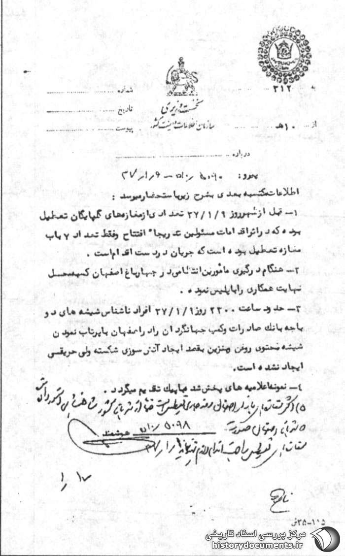 ۵- اکثر مغازههای بازار اصفهان روز جاری تعطیل است. ضمناً از شهربانی کشور شاهنشائی دستور داده شده که شهربانی اصفهان صورت مغازههای تعطیل را جهت اقدام لازم تهیه نماید.