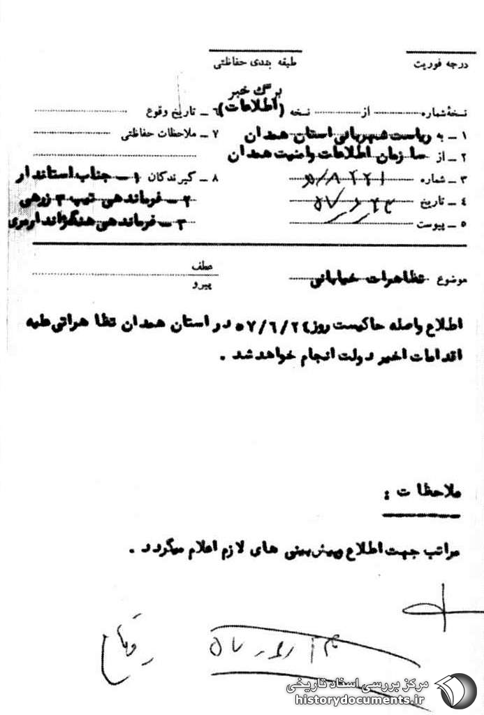 اطلاع واصله حاکیست روز 24 /6 /57 در استان همدان تظاهراتی علیه اقدامات اخیر دولت انجام خواهد شد.